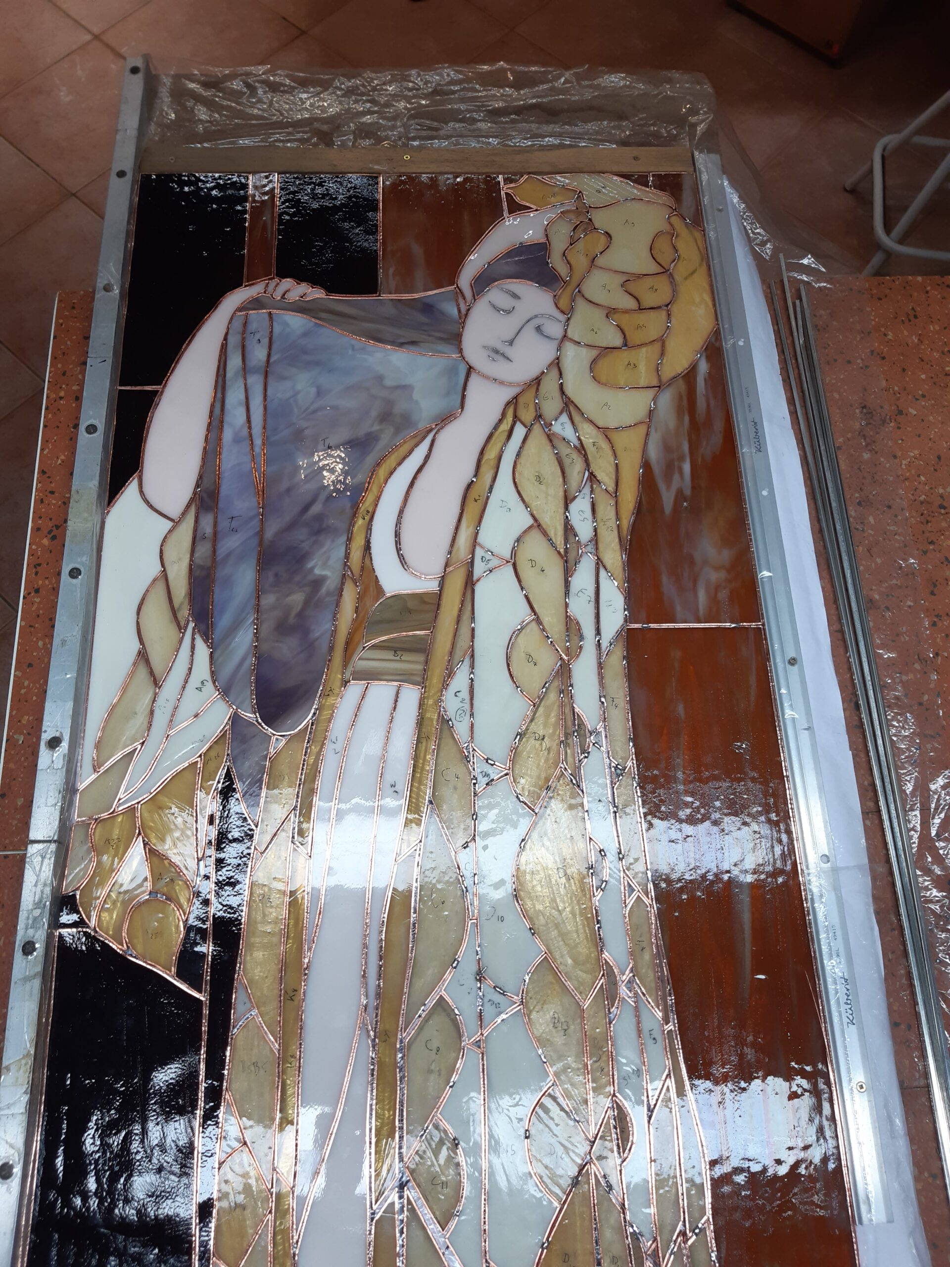 This glass panel transfers the masterpiece “Light of the Harem” by Frederic Leighton into glass. I always admired that painting for its supple beauty and this is my “glassy” reverence to it. The now finished piece is for sale.